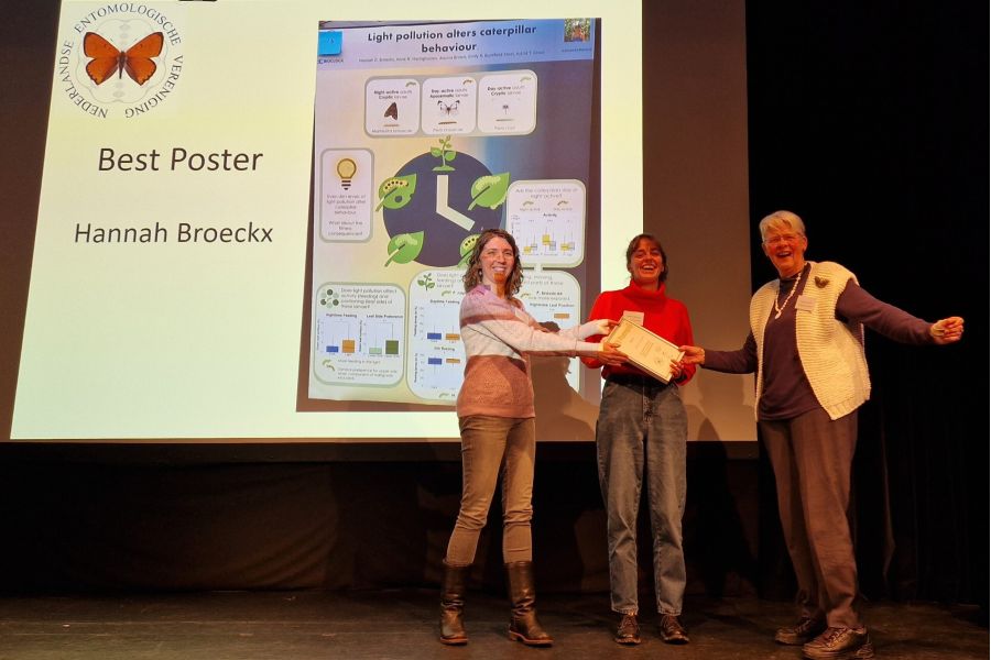 Op vrijdag 13 december heeft Hannah Broeckx de posterprijs gewonnen tijdens de jaarlijkse Entomologendag van de Nederlandse Entomologische Vereniging (NEV). De Entomologendag is een evenement dat draait om de studie van insecten, ook wel entomologie genoemd. Het biedt een platform voor het delen van kennis en inzichten over insecten en hun rol in de natuur en samenleving. Deze jaarlijkse bijeenkomst trekt een divers publiek van entomologen, wetenschappers, studenten en vertegenwoordigers uit de industrie.