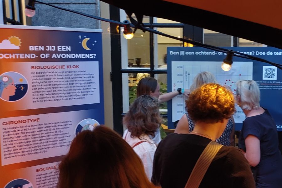 Afgelopen zaterdag waren BioClock onderzoekers Merlijne Smit en Laura Kervezee bij het kunst- en kennisfestival De Nacht van Ontdekkingen. Op deze prachtige zomeravond hebben zij een korte publieksactiviteit neergezet in de Hortus Botanicus in Leiden. De bezoekers van het festival konden via een kort online testje ontdekken of zij een ochtend- of avondmens zijn. Hun resultaat konden zij zichtbaar maken door een sticker te plakken op een poster, die aan het einde van de avond een mooi overzicht gaf van het slaap-waakritme van de festivalgangers. Deze publieksactiviteit werd ter plekke op een interactieve manier geëvalueerd: meer dan 200 bezoekers hebben hun stem uitgebracht door een muntje in een van de stemcontainers te gooien. De resultaten van deze evaluatie zullen gebruikt worden om in de toekomst een nóg interessantere activiteit neer te zetten.